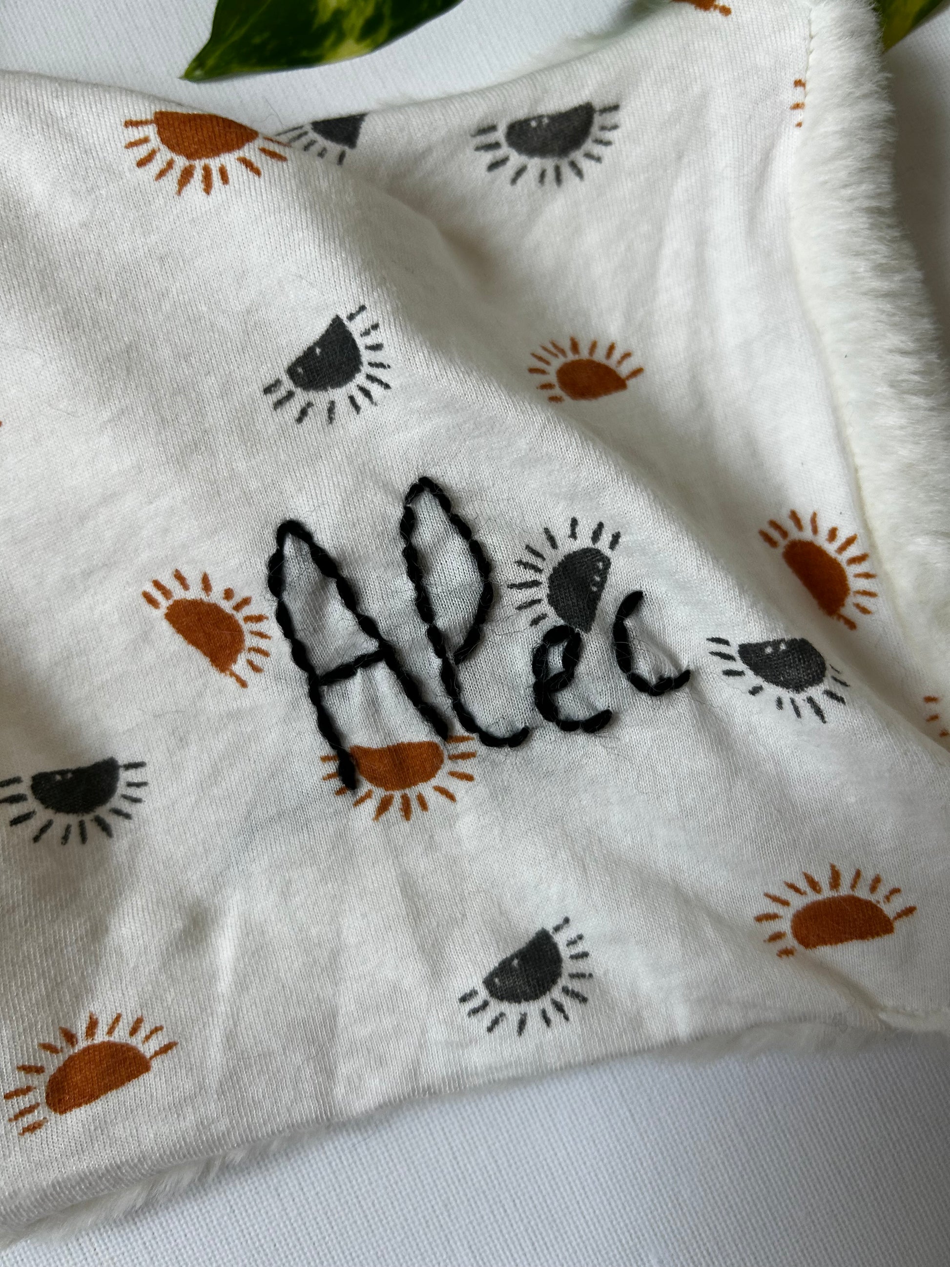 Indiquez le tissu choisi et le prénom à broder dans la section “Instructions supplémentaires” du panier.